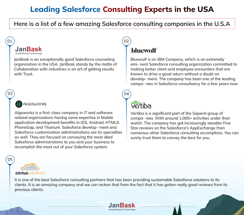JanBask is a reliable international Business and IT Consulting Company. Its professionals will help your company to harness expertise which will definitely result in augmented sales, services and functioning effectiveness. It will aid you to control the true potential of Salesforce platform & its worthy products to drive important customer value for your enterprise. Its team of many certified experts will leave no stone unturned to give you the best of the Salesforce platform.